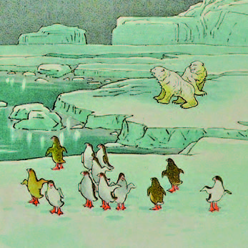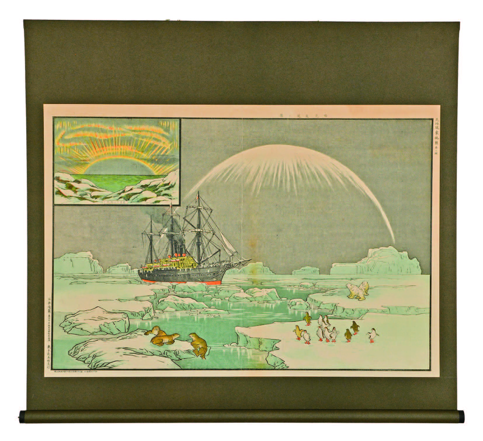 オーロラ(英語: aurora)は、天体の北極・南極近辺に見られる大気の発光現象で、極光とも言われています。両極点では通常見られず、オーロラ帯という両極点周辺の楕円上地域で見ることが出来ます。「極光発現ノ図」は、人類の極点到達前に制作されており、北極に生息する「北極熊」と南極に生息する「ペンギン」が同じ絵に描かれているところが興味深い点です。